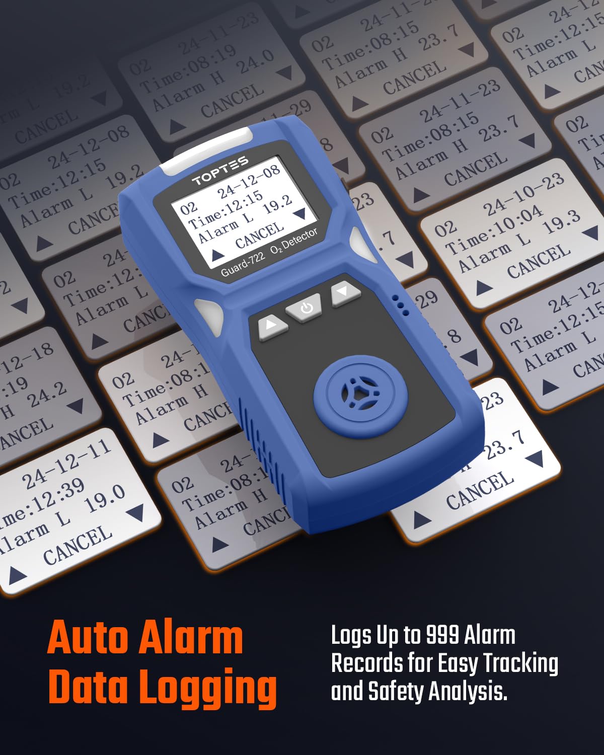 Quick Detection, Triple Alarm: O2 monitor is designed to measure oxygen levels in natural and industrial environments. When oxygen concentration reaches a preset level, the device triggers alarms (LED light, vibration, and sound). Default alarm threshold: 19.5%-23.5%. also features automatic alarm data logging for tracking and safety management